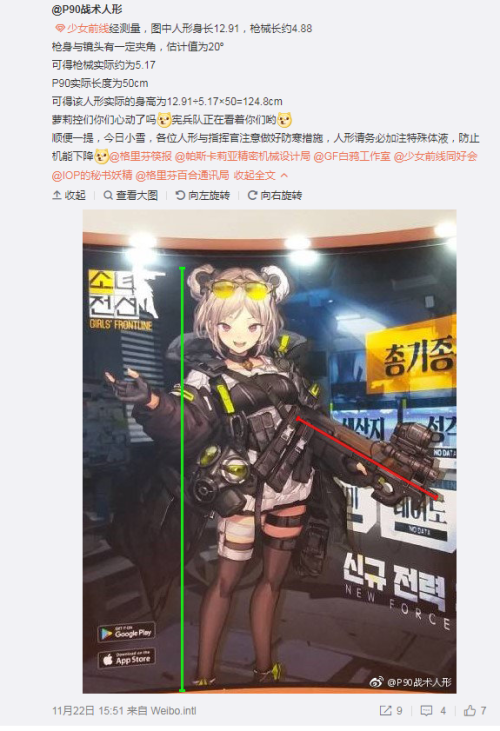 也即是根据P90全长50cm的样子。推算出P90的身高大概就是120cm+不到130cm但是依然比某个1米1高。 |