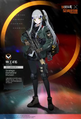 特工416是在少女前线×全境封锁联动活动“暗金潮”中登场的角色,由少女前线角色HK416的形象融合全境封锁的游戏元素后得来。于2020.11.26加入游戏。